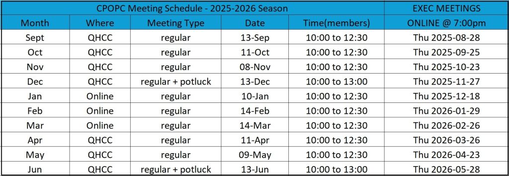 For the 2025-2026 season our meetings will be a mix of in-person and online (via Zoom) meetings. There will be no hybrid meetings combining in-person and online meetings. In-person meetings are held at the Queenswood Heights Community Centre, 1485 Duford Dr, Orléans, ON K1E 1G1.